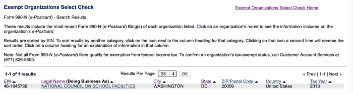 Search results showing NCSF filed a Form 990-N (post-card declaration of receipts not >$50K) so did not have to file a full-size Form 990 or 990EZ.