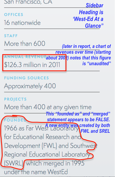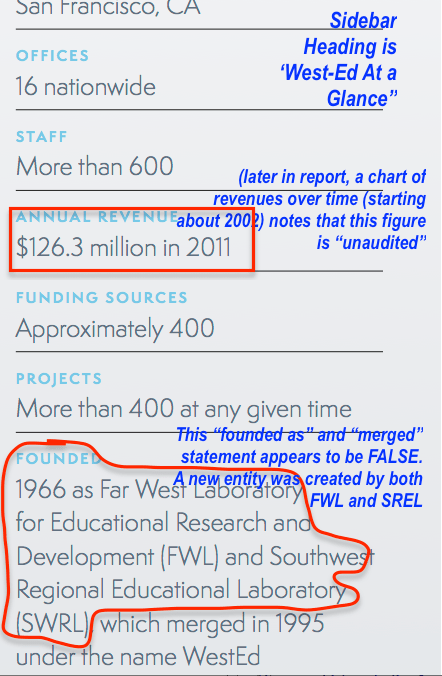 Just Do it! Do the Drill-Downs to See ‘What Lies Beneath.’ Or, Continue to “Take It On Faith” in the Multi-campus, Digitally Driven, Public/Private Partnership Mega-Church aka, the U.S.A. » WestEd AnnualRept2011 (excerpt) repeats the Founded 1966 un-truth as on main website-WesEd did NOT exist before 1995! SShot2017May02 @6.03.22 PM