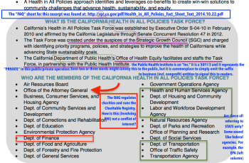 California HiAP Task Force is listed as a Partner. It seems to represent a consolidation of 22 gov’t departments around the policy, fine print here (on the Oct. 22, 2014 FAQs sheet doesn’t even name people, just departments but also (eventually) divulges the involvement of another significant (and well-heeled) nonprofit in Oakland, California — Public Health Institute (“PHI”). The UCBerkeley Center (“CC+S”) Partner page, however, says nothing about this. Several places I looked linked to a California government page on the “HiAP Task Force,” which links were already broken.