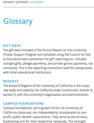 Here’s 2015-2016 and a piechart from it showing how high, and by sector, and a table showing private donations (state-wide, all campuses) by Discipline. After that, it breaks it down by campuses, and finally, the glossary shows that this a standardized reporting used for comparison between universities (“Council for Aid to Education “conventions). Bottom line here? It doesn’t show funding to a specific Center within a single campus, and doesn’t show fund#s.