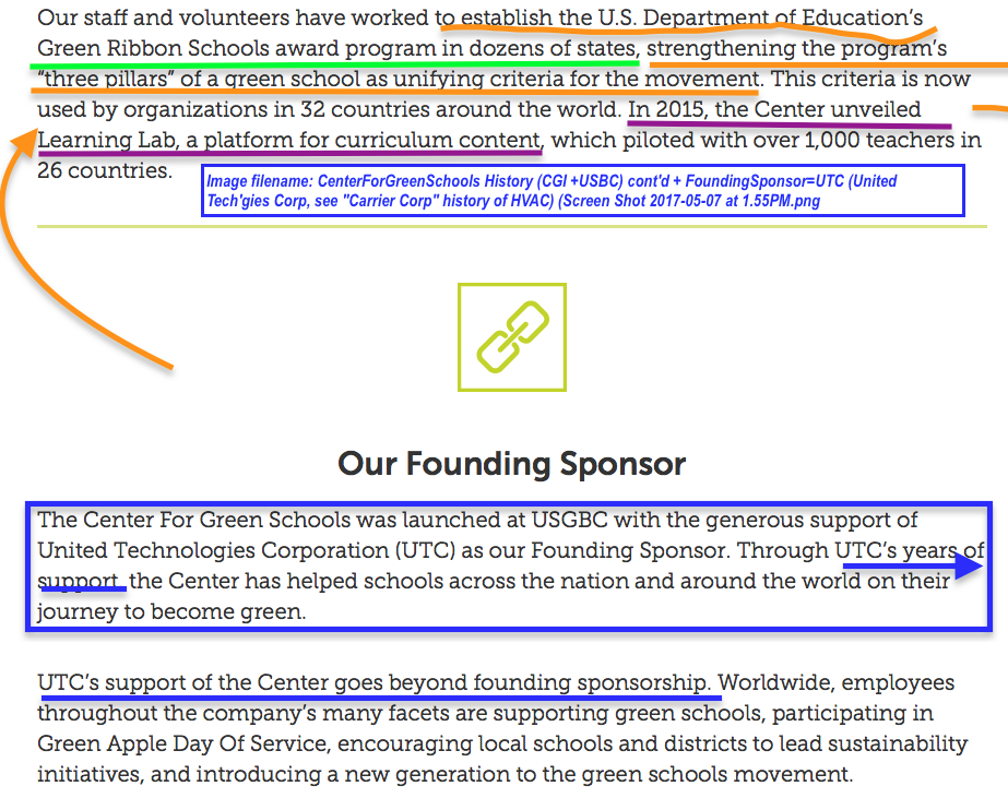 Today’s Lesson — Show-and-Tell (and what’s not told) re: ~Annenberg Learner~ and Annenberg Foundation ~Education Initiatives~ (published May 10, 2017) » CenterForGreenSchools History (CGI +USBC) cont’d + FoundingSponsor=UTC (United Tech’gies Corp, see Carrier Corp history of HVAC) (Screen Shot 2017-05-07 at 1.55PM