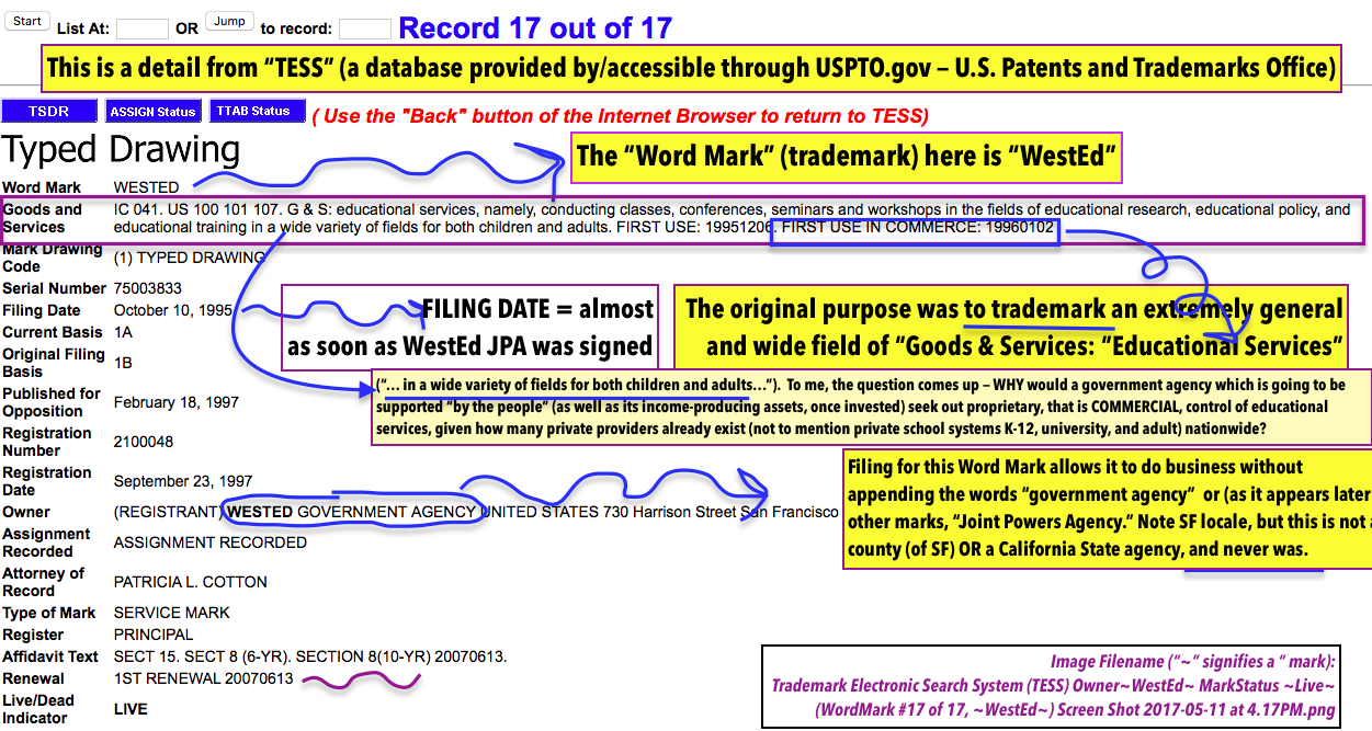 “DISCONNECTED!” — More on ConnectEd (2006ff nonprofit) and WestEd (1995ff JPA claiming to be since 1966). Can YOU Follow the Connections, Find and Correlate the Financial Statements, and Name the EndGame(s)? [Publ. May 11, 2017, updated twice since]. » Trademark Electronic Search System (TESS) Owner~WestEd~ MarkStatus ~Live~ (WordMark #17 of 17, ~WestEd~) Screen Shot 2017-05-11 at 4.17PM