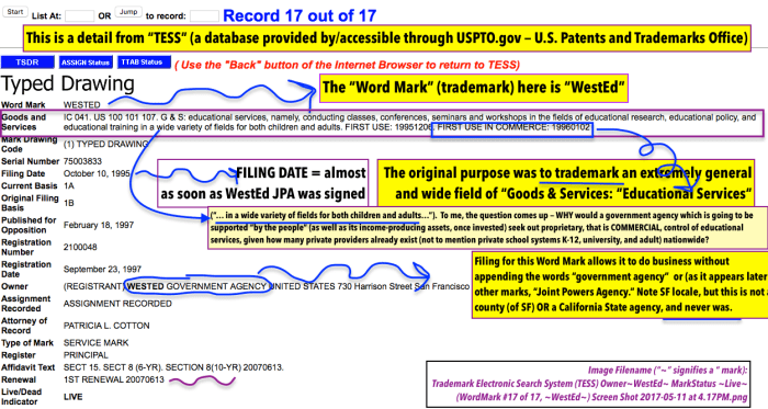 Click image for my commentary! (Detail on WordMark “WestEd” #17 of 17 on this particular search.) Click HERE for a cleaner copy, with more header/footer info from the government website, but my comments entail questioning why a government entity of this scope is filing for trademarks, i.e., planning to enter major-sector commerce in a major way [and thereafter, fails to produce proper reports for the public.]
