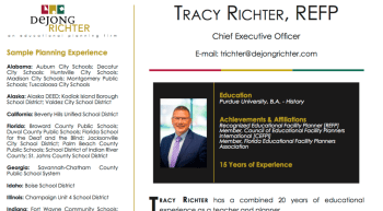 Briefly, DeJong-Richter is in Hilliard Ohio (<==services described). Tracy is the guy in the center, and his bio features “REFP” certification — that’s “Registered Educational Facilities Planner” and two associations along the same lines. (next two images); the bio is accessible from the main site under “People”):