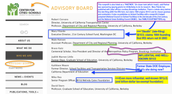 I started to look at CC+S itself in recent post. ONE if its named partners (there are several) is called the California HiAP Task Force which — from what I can tell so far, just represents 22 government agencies, some which may be federal, but I can’t really tell. SPECIFIC INDIVIDUALS ARE NOT NAMED. In addition the 21st Century School Fund, Inc., is the first listed “partner” (and its exec director also shows up under “Advisory Board”) of CC+S. Being a Center at an Institute, finding its exact budget is daunting. Perhaps a dedicated individual might do so, or a paid individual might be even more motivated to do so.