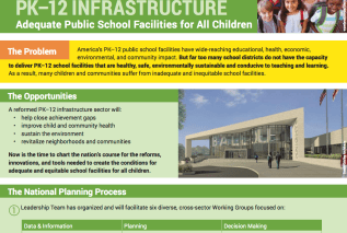 Through this initiative, six national cross-sector working groups have developed a menu of solutions to guide government, industry, labor, and the civic sector in the delivery of high performance public PK-12 infrastructure for all children. The six working groups are organized around basic elements of a well-managed facilities program: Data and Information, Educational Facilities Planning, Management, Funding, Governance and Decision Making, and Accountability. This map identifies policies, practices, and tools needed to structure, manage and fund the public and private capacity for equitable and efficient public school facilities for all communities.