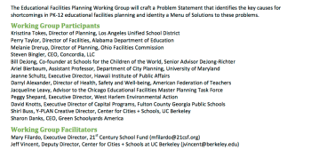 Darryl Alexander, Director of Health, Safety and Well-being, American Federation of Teachers Jacqueline Leavy, Advisor to the Chicago Educational Facilities Master Planning Task Force Peggy Shepard, Executive Director, West Harlem Environmental ActionDavid Knotts, Executive Director of Capital Programs, Fulton County Georgia Public Schools Shirl Buss, Y-PLAN Creative Director, Center for Cities + Schools, UC Berkeley
