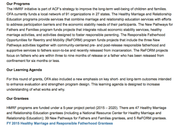 The federal agency (not private nonprofit named after “state governments”) HHS, under HMRF.ACF.HHS.Gov also had a natural focus on Prisoner Re-entry underneath its marriage/fatherhood programming (next few images. Notice that the top of the page says HMRF, but the links and content includes Re-Entry programming. Some pages I’ve excerpted read “last reviewed June 16, 2017.” Notice the funding is $150M/Year for 5-year period, and it at least lists how many organizations got the grants. It doesn’t, however (also notice) suggest to the reader where they might go look up some more — like at TAGGS.hhs.gov!