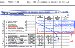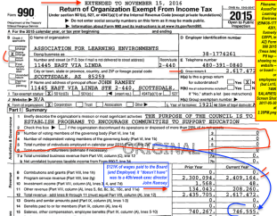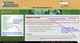 This grandiose-sounding entity (CEFPI) Council of Educational Facilities Planning International in Scottsdale, AZ: abruptly changed its name in Sept. 2015 to “Association For Learning Environments” (A4LE.org); is clearly organized regionally (country and state lines are well, who cares about them? — although that affects support of public school funding!); and is nevertheless conducting professional training for other entities apparently, like AIA. I saw the forms. I looked at the Forms 990 (earliest available, and most recent) and I showed a local friend, as in “rubbing my eyes — is this what I think it is?” on the tax returns.