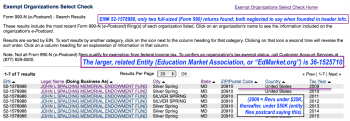 (Click to see Full-sized)EIN# shown as having filed Forms 990-N (statement of low revenues) 2009 – 2015 from IRS Exempt Org Search website -relates to the current “EdMarket.org (Education Market Association) a 501©6 entity in MD