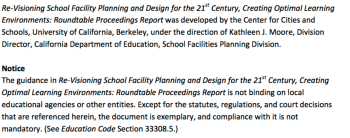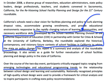 Oct. 15-16 2008 Roundtable “Re-Visioning School Facilities Planning for the 21st Century,” Report as posted on CDE.ca.gov (Calif. Dept. of Educ)This is 68 pages long, double-spaced.