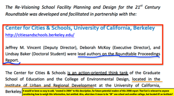 Notice that even the subtitle “Learning Environments” echoes what will later (2015?) become part of an association name while the title, of course combines two phrases already co-opted in combination by “21st Century School Fund,” whose executive director is on the roundtable (despite coming from D.C., not California) and also acknowledged by the roundtable report preparers (CC+S UCB), whose co-directors were its lead authors, etc.