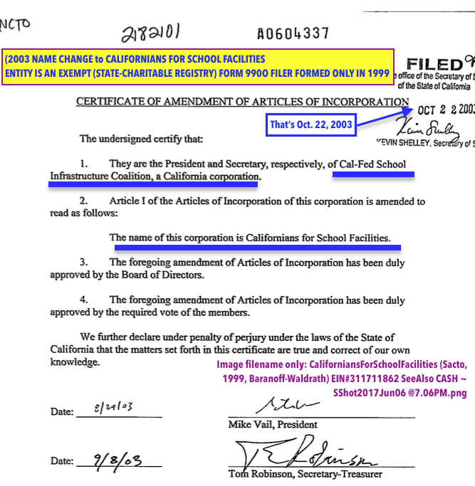 2003 Amendment (at CA SOS) shows its earlier name was “Cal-Fed Infrastructure Coalition” before it became “Californians for School Facilities, Inc.” (“CFSF”).