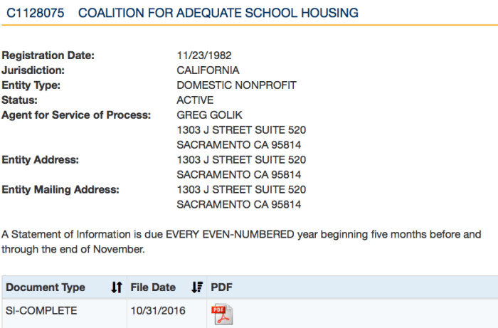 Calif. SOS filing showing Cal Entity# for CASH , address, and that it’s a domestic nonprofit (and current)