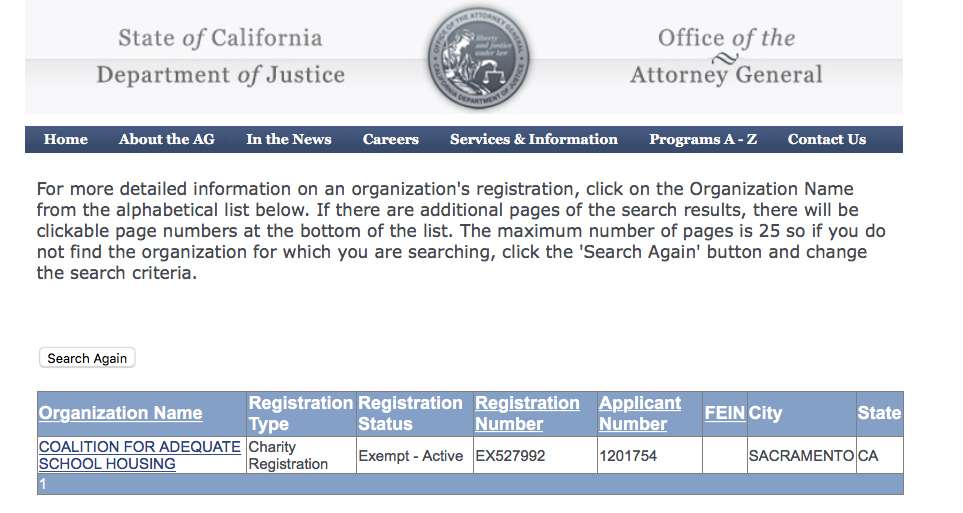 Calif OAG Registry of Charities showing CASH doesn’t have to register at state level (it’s a mutual benefit org.) It has an EIN#, but not shown here.