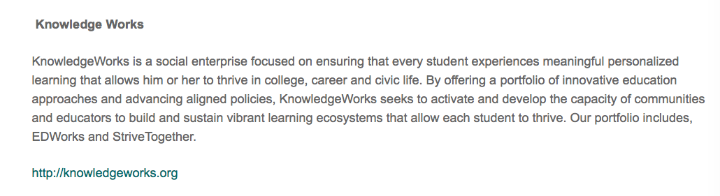 KnowledgeWorks as Level I Corporate Partner to (see CSSO.org), self-described as a “social enterprise” and not a tax-exempt foundation with trademarked products and a Form 990 that can be looked up.
