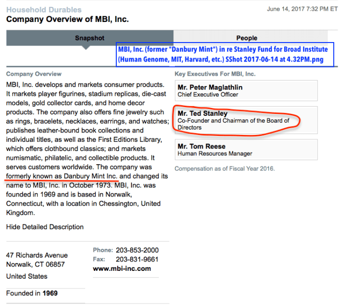 MBI, Inc. (formerly the Danbury Mint), Chairman of the Board is “Ted Stanley” (from Bloomberg.com). cf. 7% funding of initial $40M (or so) for the Stanley Fund for The Broad Institute (startup 2013, first major funding 2014, first tax return FY2015, it looks like)
