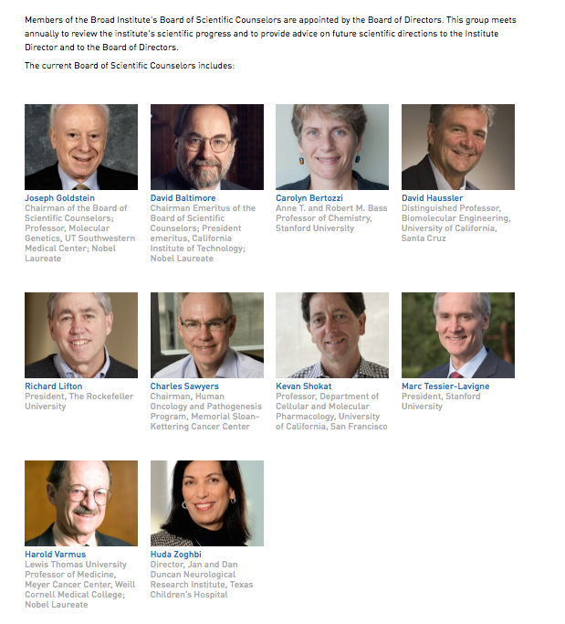 It’s small, gray font, but look at the universities involved in Broad Institute’s Scientific Advisory Panel (that’s all of them)