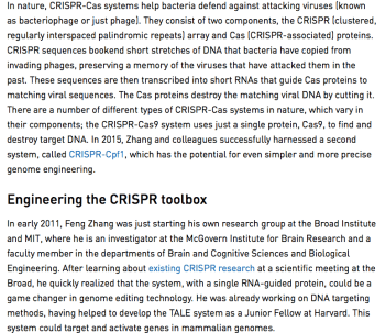 Descrip. of things CRISPR (excerpt) from The Broad Institute, notice claim of discovery. Click image for whole page.
