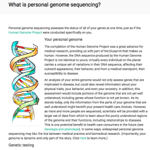 Instead, they got an advertisement (the only link within that article) to Personal Genome Sequencing (I’ll call it “PGS” here for short; they don’t), and for the Human Genome Project; see next image, which is from that page, again titled (window frame and page itself) What Is Personal Genome Sequencing? and over the process of the page including a link back to the genotype/phenotype one above, does NOT tell what PGS is: See next image, and the only paragraph on the page where they might have actually defined “personal genome sequencing,” but never quite got around to it. They talk about it, but do not answer the question, “What is personal genome sequencing?” with a functional statement “personal genome sequencing IS.”