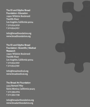End matter from report @ Broadfoundation.org shows two different entities but 3 different listings, rather than one “Foundation” and under it, showing contact Email and Tel. for EDUC and another for ART, which would be visually, a little more honest, while technically, nothing wrong. How hard would it be to show — here– that “The Broad Foundations” (grandiose, and other philanthropists — such as “Price Philanthropies — use the phrase) are in fact, only two.