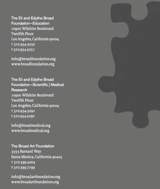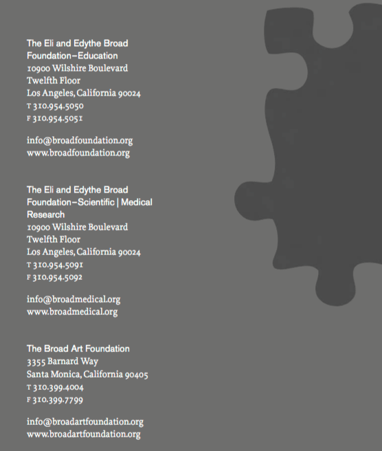 End matter from report @ Broadfoundation.org shows two different entities but 3 different listings, rather than one “Foundation” and under it, showing contact Email and Tel. for EDUC and another for ART, which would be visually, a little more honest, while technically, nothing wrong. How hard would it be to show — here– that “The Broad Foundations” (grandiose, and other philanthropists — such as “Price Philanthropies — use the phrase) are in fact, only two.