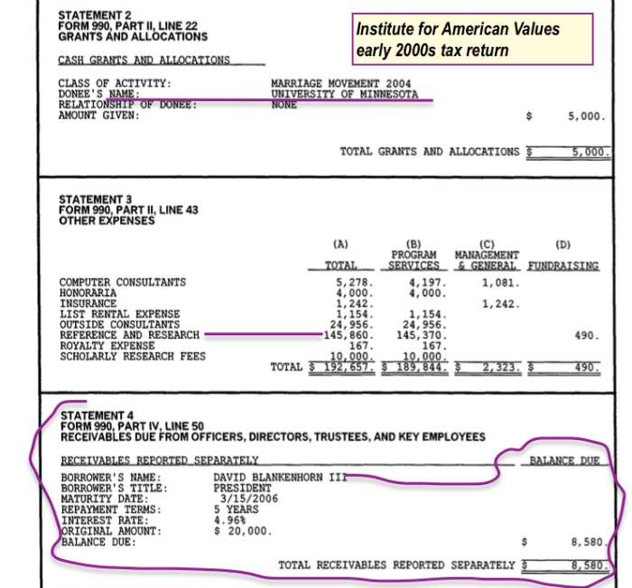 #3 of 5, IAV (EIN#133400377 DBlankenhorn) Early (02,03) Form990 excerpts. Grant to Maggie Gallagher + Dartmouth, and Other Expenses (see “Research”) and his $20K 5-year 5% loan from his own 501©3 (despite $210K salary).
