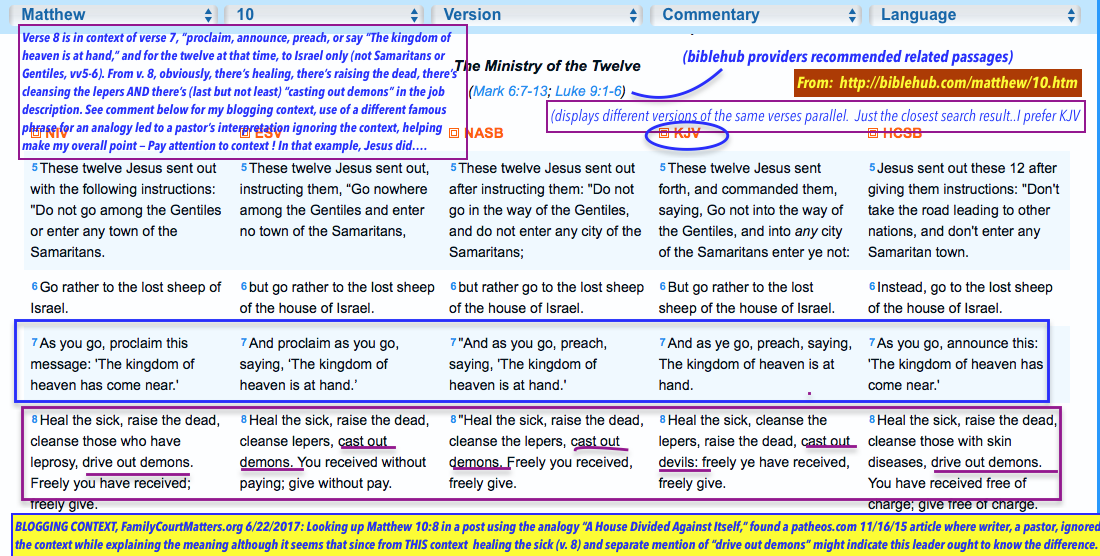 Good Cop, Bad Cop (not to mention Camouflage) in the Federally-Funded Gender War, Classic Examples (Inset, Callout or Footnote to my other 6/24/2017 post) » Marching Orders for The Twelve (Matth 10 5-8, parallels)(Go to Israel ONLY, Talk up The Kingdom, and [Do 4 things] Heal Sick~Raise Dead~Cleanse Lepers~Drive out Demons) ScrShot 2017-06-2