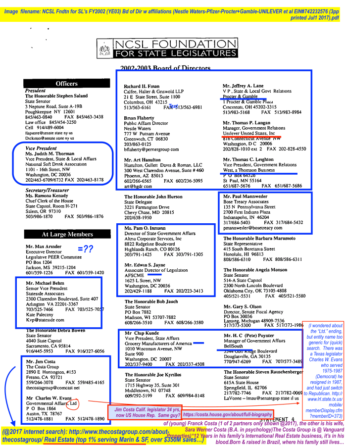 Do You Know Your: NGA, NCSC, NCSL, NCSEA, NCJFCJ, NCCD, NACC, and NASMHPD, not to mention ICMA? [Written Oct. 25, 2014**, split in three; this part published June 30, 2017] » NCSL Fndtn for SL’s FY2002 (YE03) Bd of Dir w affiliations (Nestle Waters-Pfizer-Procter+Gamble-UNILEVER et al EIN#742232576 (pdf 3pp, Png=P1 only) printed @Jul1 2017
