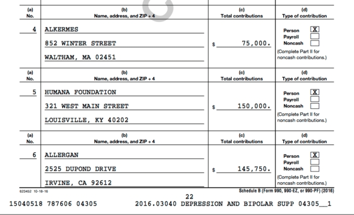 DBSA website volunteers its Sched B Contributors (for year shown) on its website. Note who they are (3 images, click to enlarge any of them).