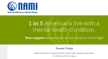 NAMI home page solicitation demonstrates its missing grammar awareness (“1” is singular, so verb should be “lives” not “live”) but awareness that scaring Americans with statistics about prevalence of “mental health condition” still might lead to increased donations.(??)
