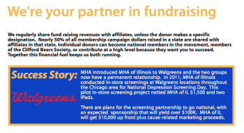 Both MHA (an earlier organization) and NAMI are really big on affiliate organizations. MHA talks about this on its website, claims over 200 affiliates (and expanding) and of course, provides in exchange, specialized resources, including access to toolkits, use of the “mental health bell” (logo), and more (next 5 images downloaded July 1, 2017 give the general idea).
