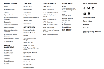 NAMI is the official business entity name; its former name until 1997 change was “National Alliance on Mental Illness.” Forms 990 read founding date 1985, as a Missouri entity, but (at least by 1997) an Arlington Virginia (i.e., closer to D.C.) entity address. HOWEVER, please note (taken from the website’s extensive footer, each title shown, for the most part, would be an active link, and the Terms of Use show both the trademarks, and that use of the website is considered to be controlled by Virginia — not Missouri — laws. (see two B/W images below home page, shown with spring-green banner):