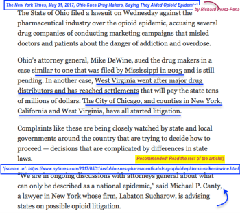 Below that (another image) May 31, 2017, the NYT references an Ohio Lawsuit (Ohio Sues Drug Makers, Saying They Aided Opioid Epidemic) and that this is a national epidemic promoted in part through funding provided to “prominent doctors, medical societies and patient advocacy groups” but made SURE not to reference anyone who might be associated with TMAP/PennMAP (such as NASMHPD, discussed in this post and referenced in the last one), or under “patient advocacy groups,” “NAMI” although what are the chance the attorneys general knew nothing about these?
