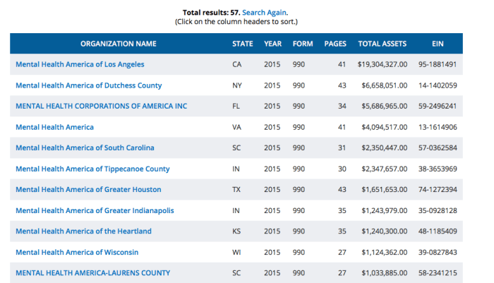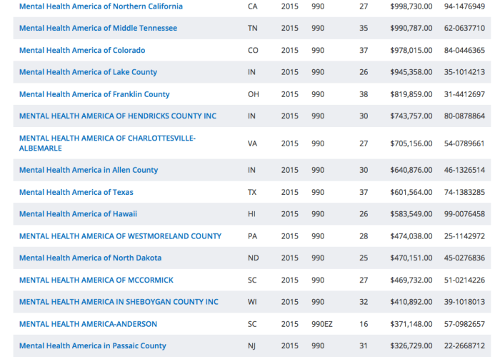 Even a quick look at “Mental Health America” Form 990s, sorted by “Total Assets” column (which represents gross assets at, I believe, beginning of the tax year) from largest to smallest, and by narrowing to just FY2015 (which if their fiscal year =/= calendar year, may include some FY2014), got 57 results (and possibly one straggler (3rd row, in FL) which may not be an affiliate). It also shows that the Los Angeles one is far larger (by total assets shown) than the parent one simply called MHA.