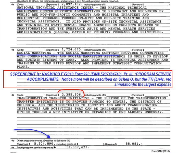 NASMHPD FY2010 Form 990 page 2, Program Service Accomplishments. (Shown to highlight the TTI, see red ink).
