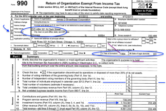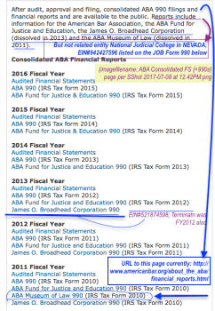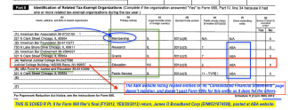 The screenprints here relate especially to the ABA Fund for Justice and Education (formed in 1961), but they are FROM the main ABA tax return. For reference, the ABA Fund for Justice and Education last three tax returns are here: