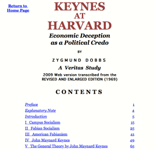 KEYNES AT HARVARDEconomic Deception as a Political CredoBY ZYGMUND DOBBS A Veritas StudyAMERICAN FABIANISM:The permeation of the United States by British Fabian socialism proceeded primarily through the universities. The main root of Fabian “permeation” was Harvard University. Fabian socialists as well as Marxian socialists selected Harvard as the fount from which leftist ideology filtered through to other educational institutions. Later the communists borrowed from the socialists the formula of incubating revolutions through universities.(1) …
