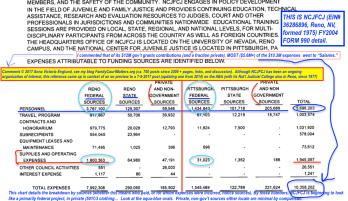 NCJFCJ also has two related entities (a “Fund” and a “Foundation”) (Sometimes much earlier tax returns will reveal more about their directors or some of the details, than later ones. The IRS Form 990 changed dramatically in 2008. The earlier one listed government vs. non-government contributions on Page 1 but little corporation detail (# of employees, board members, volunteers, etc.) on Page 1. later ones moved the gov’t./non-gov’t. contribution details to Part VIII, Statement of Revenues, and more details on Expenses to Part IX.