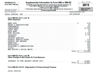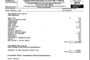 While I have the momentum (taking screenshots, labeling them, etc.) here, using light-blue-background captions (and you’ll also notice a different, clearer font organizations often use for the public, website-posted tax returns, when they may choose to post some) are several excerpts from the same year’s (2015) Tax return, posted for public viewing at ChildJustice.org. Which, I notice, still has “website N/A” on page 1.