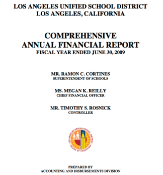 LAUSD CAFR 2009 (excerpt #1 of 2; see image for source url). Notice the language emphasis (deficit budget cut services etc.)