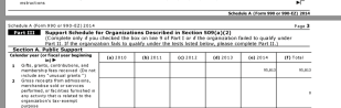 Same yr, same tax return, Sched A, Total Contribs is now $95,813 ($98,513 – $95,813 = a noticeable amount for such a small org.). ALSO notice — no acknowledgment of support received in 2013 (blank column (e)). Conflicts with other info.