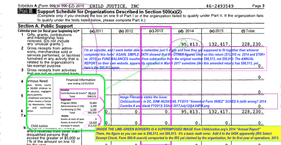 Featuring Five Vital Posts on …. Our Assigned Places in the Tax Continuum Pecking Order (from ABA, APA post update) [Publ. July 12, 2017] » ChildJusticeInc in DC, EIN# 462593549, FY2015 Amended Form 990EZ SCHED A (with wrong? 2014 Contribs # and blank FY2013) SShot 2017July12@4.04PM