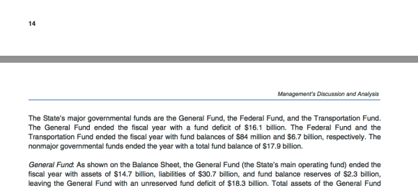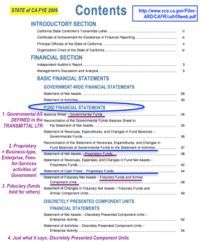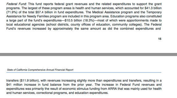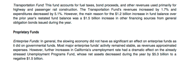 The Table of Contents shows that Brown wasn’t even quoting from the “Basic Financial Statements” section (the columns of numbers, well-labeled), which clearly outline by name what types of funds (Governmental, Proprietary,* Fiduciary, Discretely Presented Component Units (of the State of California) Enterprise* statements) the charts of numbers are presented. Taken as a whole, and with the preceding and following explanations, they represent the whole. Why not quote the actual consolidated figures, totaled, from the whole state, also showing an ability to read labels and the effort to do a little simple math (totaling the totals)? ….