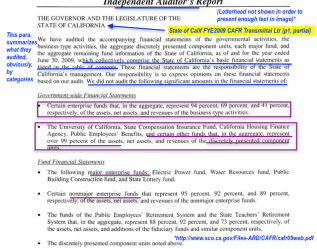 The Transmittal letter (“Independent Auditor’s Report”) w/ annotations again shows clear categories of statements audited and which entities’ statements were included, but not audited by this auditor. Paragr. 1, 2nd blue underline starts the disclaimers listing below which financial statements it did NOT audit, including the one for CalPERS (“Public Employees Retirement System,” next to last bullet). The two categories of financial statements shown there are “government-wide” and “fund financial statements” as you can see are also separated into “Government-wide” and “Fund” statements.