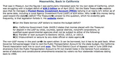 The article (Ms. Brown) then goes on to reference her invitation to speak at a state (Missouri) chapter of the GFOA (Government Finance Officers Association), then jumps back to affairs in her (and currently my) home state of California.
