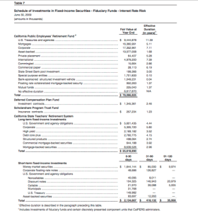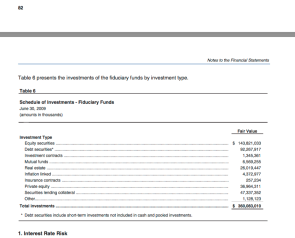 IN fact, the next page (p. 84, Table 7, from the California State CAFR YE June 30, 2009, image also below) which shows investment vehicles, for CalPERS and CalSTRS only (i.e., not all four types of fiduciary funds held by the state) shows that CalPERS holding $78B and CalSTRS $25B — in ‘Fixed Income Securities’ with a footnote on CalPERS that this includes also “fiduciary funds and certain discretely presented units that CalPERS administers.