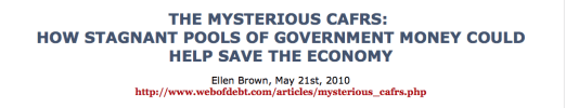 (a section from webofdebt.com/articles/mysterious_cafrs.php = “The Mysterious CAFRs: How Stagnant Pools of Money Could Help Save the Economy,” by Ellen H. Brown in “Web of Debt.”