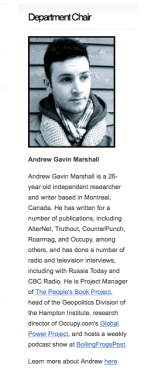 I did not review Andrew Gavin Marshall before publishing this post, just noted that he was mentioned prominently with Chossudovsky on the “GlobalResearch.ca” website. Here’s a bio blurb from “Truthout” as well as an image, which will give a general idea. There’s a long list of articles on the same site. The dates are not displayed, but top one around Dec. 2015, bottom one, 2012.