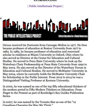 @ http://www.HenryAGiroux.com. (Truthout Bd of Directors) There’s more on the page). Public Intellectuals Project has support from Social and Humanities Research Council of Canada (or similar — click, see bottom of page fine print). NB: Carnegie Mellon, Boston U degrees, 12 yrs at Penn State U, then moved to a Canadian university (McMaster) in 2004, still there. His status as one of “top 50 educ. thinkers of the modern period” (Routledge honor) happened thus while at PSU.